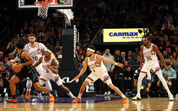 太阳队首发:德文-布克、凯文-杜兰特、尤素福-努尔基奇、布拉德利-比尔、奇梅齐耶-梅图